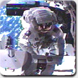 Click on the photograph to replay part of the first spacewalk using Windows Media Player or click Real Format or Quicktime Format. |
